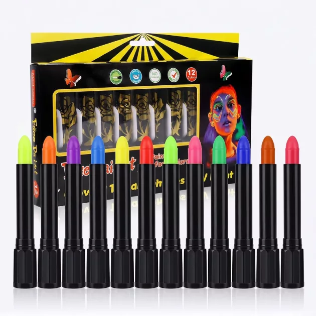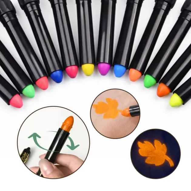 Ragyogó, kreatív színek - Az élénk árnyalatok ultraibolya fény alatt ragyognak, műalkotássá változtatva az arcokat. A szettek sokféle kombinációt kínálnak, ösztönözve a fantáziát bulikon, karneválokon és előadásokon.
