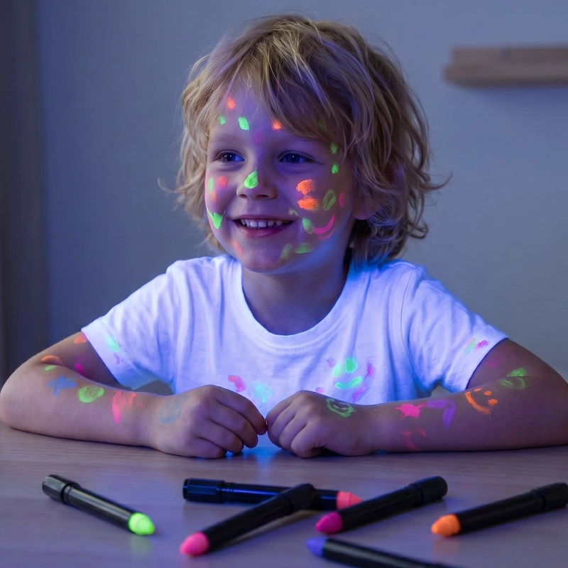 Szilveszterre vettem ezt a világító szettet. Tűzijátékokat rajzoltunk az arcunkra, nevettünk a tükör előtt az UV-fényben, és mindent dörzsölés nélkül le lehetett mosni lefekvés előtt.