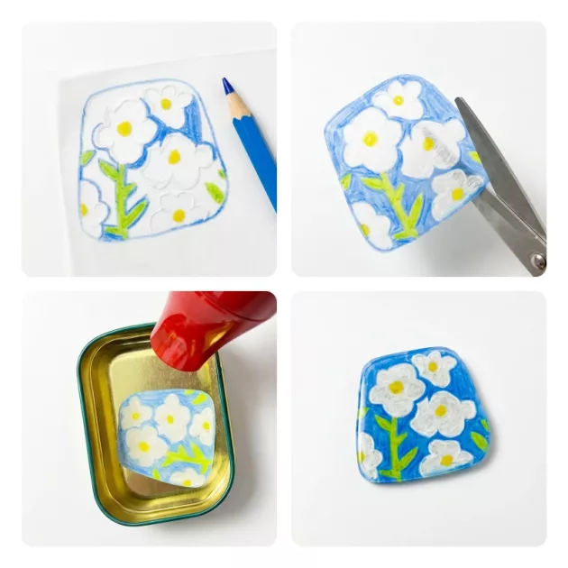 A lányommal vasárnap délután a rajzait rajzoltuk át a lapokra. Imádta nézni, ahogy apró kis medálokká zsugorodnak a karkötőjéhez.
