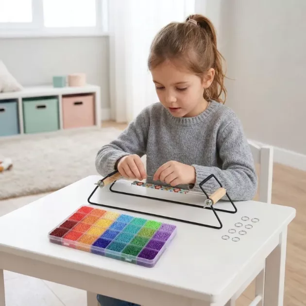 Ezt a szövőkeretet esős délutánokra vettük, és nagy sikere van. Érthető útmutató, élénk gyöngyök, és csendes, koncentrált játék még több képernyőidő helyett.