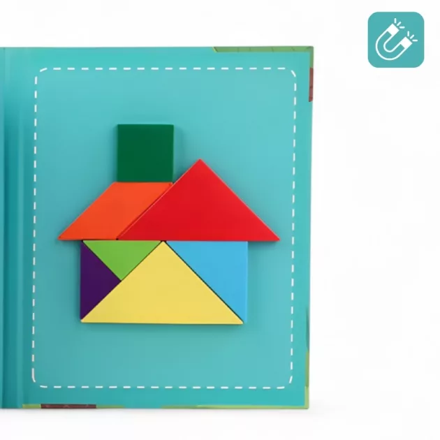 Minden este vacsora után játszottunk ezzel a tangrammal. Anyukám is csatlakozott, készítettünk autókat, rakétákat vagy madarakat. A mágnesek nagyon jól tapadnak, nem esnek le.
