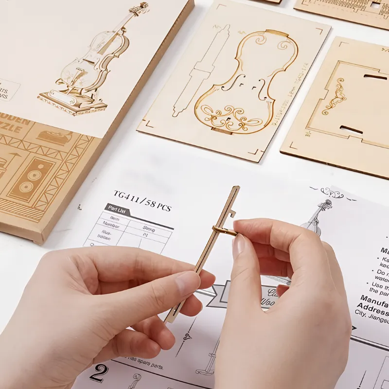 Szabadítsd fel a képzeletet közös, kézzel végzett építéssel és felfedezéssel. A fa elemek stabilan illeszkednek egymáshoz, valósághű mini hangszert alkotva. Minden rész a fókuszt, türelmet és örömteli sikerélményt ösztönzi. Nézd, ahogy gyermeked büszkén ragyog, miután elkészült.