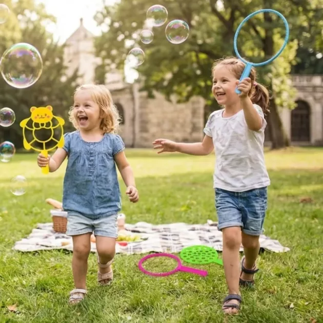 Szuper ötlet volt piknikre vinni a buborék készletet. Mindenki sorra került, és nagyon élveztük az óriási, lebegő formák készítését.
