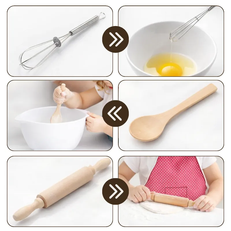 Nézd, ahogy gyermeked büszkén készíti a finomságokat! Ez a bájos készlet minden képzeletbeli sütés vagy keverés során megmozgatja a fantáziát. Játék közben segíti a tanulást és közelebb hoz egymáshoz, miközben örömteli pillanatokat osztotok meg. Minden darabot úgy terveztek, hogy órákon át tartó játékos izgalmat nyújtson.