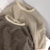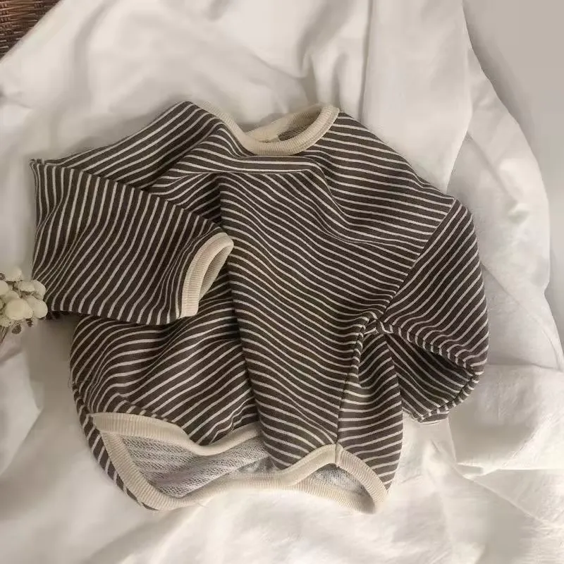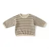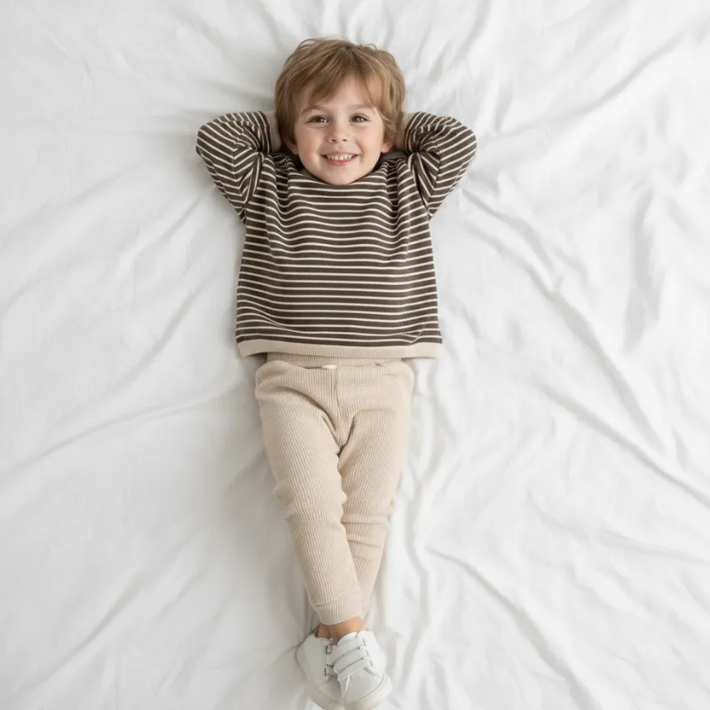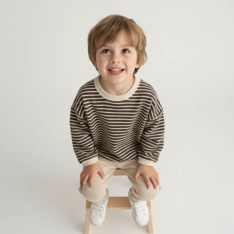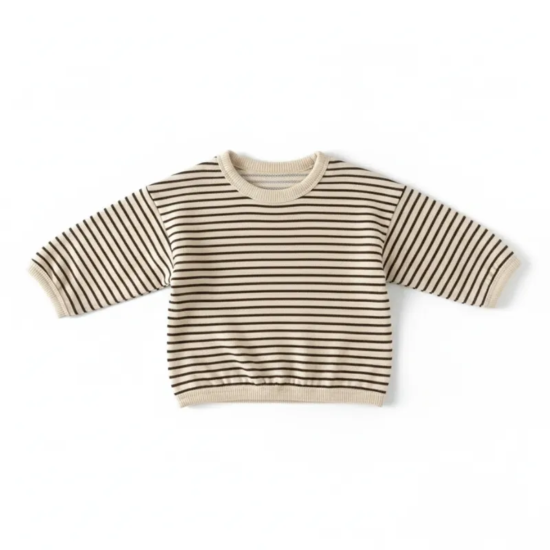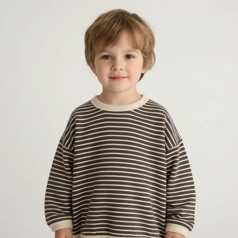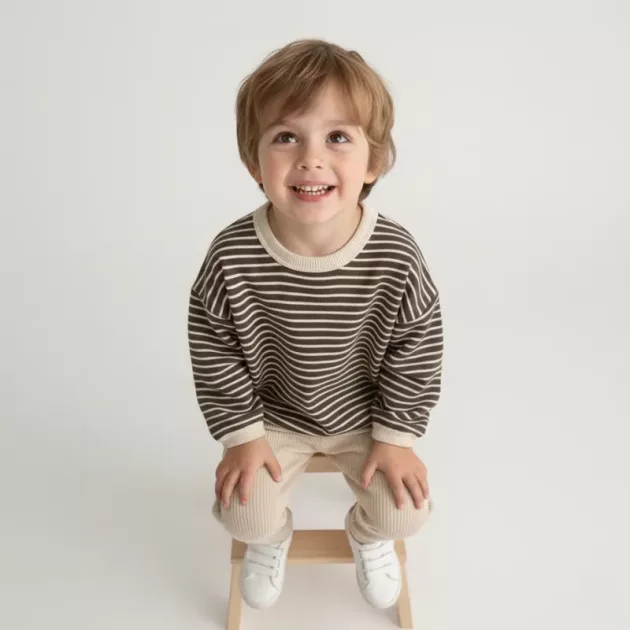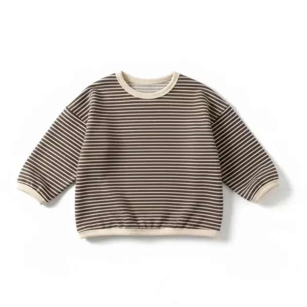 Örülök, hogy ez a pulóver puha pamutból van. A gyerekem szerint hűvösen tartja, amikor szaladgál. A csíkok különösen aranyosak rajta.
