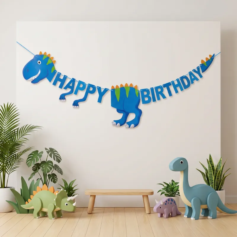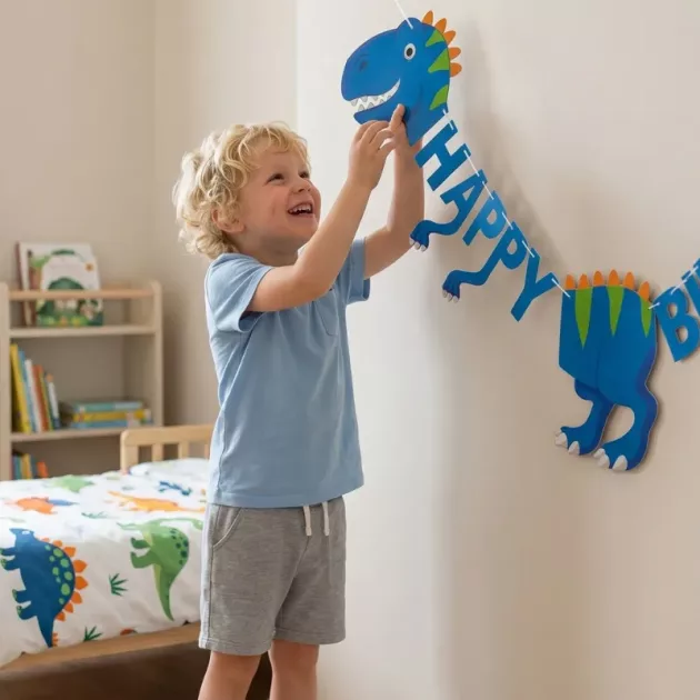 Ezt a dínós zászlófüzért a fiam hatodik születésnapjára vettem. Élénk színek, cuki dínófejek, és azonnal bulihangulatot varázsolt a kis nappalinkba.