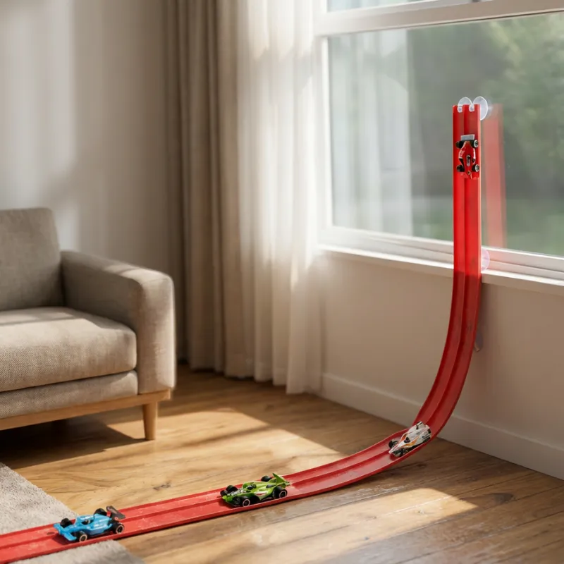 Tetszik, hogy szinte bárhol építhetek versenypályát. A kedvencem a cikk-cakk a hálószobám ajtaján. A tapadókorongok a sima falakon is működnek.