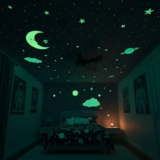 A barátaimmal a hátizsákjainkat díszítettük a világító festékkel. Szuperül néz ki a szobánkban és még jobban éjszaka.