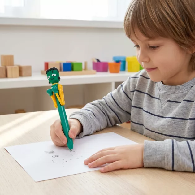 A házi feladat korábban mindig sírásba torkollott. Amióta odaadtam a fiamnak ezt a bolondos tollat, tovább ül a feladat fölött, ütögeti a figurát, és tényleg élvezi a mondatok másolását a tábláról.