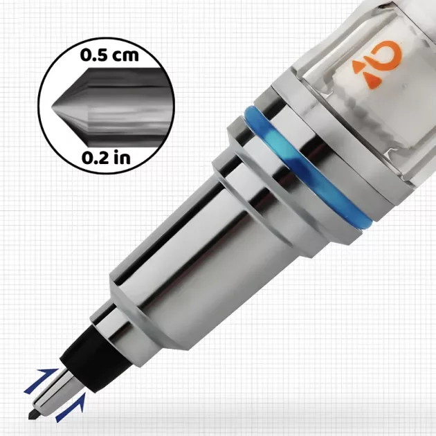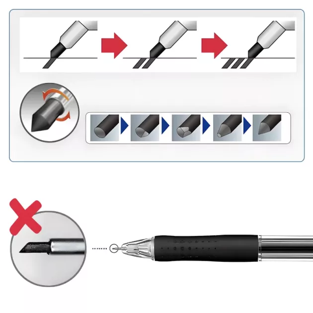 A gyermekek iskolai munkája minden oldalon rendezett és tiszta marad. Egy okos forgó mechanizmus tartja a vonalakat élesen és egyenletesen a használat során. Kevesebb törött grafit, kevesebb megszakítás és boldogabb tanulás.